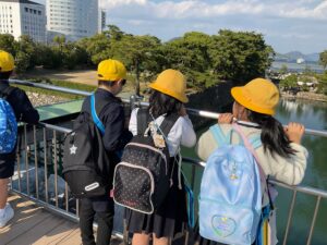 あなぶきアリーナではサブアリーナ、武道施設、メインアリーナを見学しました。子どもたちは館内のたくさんの座席や広々とした空間に見とれていました。中でもメインアリーナはとても広く、入った瞬間に驚きの声が響き渡りました。初めて訪れた子どもたちが多く、各施設にある設備や道具に興味津々でたくさん質問をしていました。玉藻公園では桜御門や展望デッキ、庭園など様々な場所を見学しました。展望デッキからの景色や庭園の花々を見て美しさに浸ることができました。